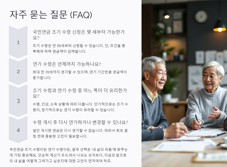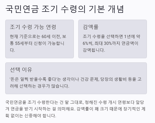 조기 수령은 만 55세부터 신청할 수 있습니다. 단, 조건을 충족해야 하며 연금액이 감액됩니다.
