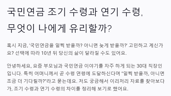 안녕하세요, 요즘 부모님과 국민연금 이야기를 자주 하게 되는 30대 직장인입니다. 특히 어머니께서 곧 수령 연령에 도달하신다며 "일찍 받을까, 아니면 조금 더 기다릴까?"라고 묻는데요. 저도 궁금해서 이리저리 자료를 찾아보다가, 조기 수령과 연기 수령의 차이를 정리해 보기로 했어요. 지금 그 내용을 여러분과 함께 나누려 합니다.