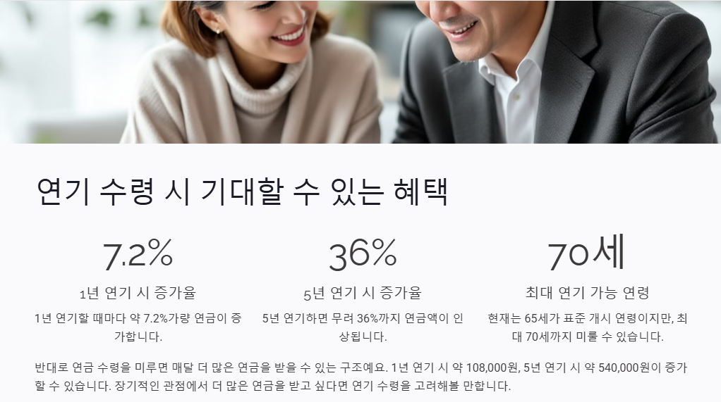 최대 만 70세까지 연기할 수 있으며, 연기 기간만큼 연금액이 증가합니다.