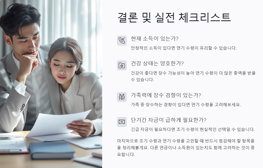 마지막으로 조기 수령과 연기 수령을 고민할 때 반드시 점검해야 할 항목들을 정리해볼게요.