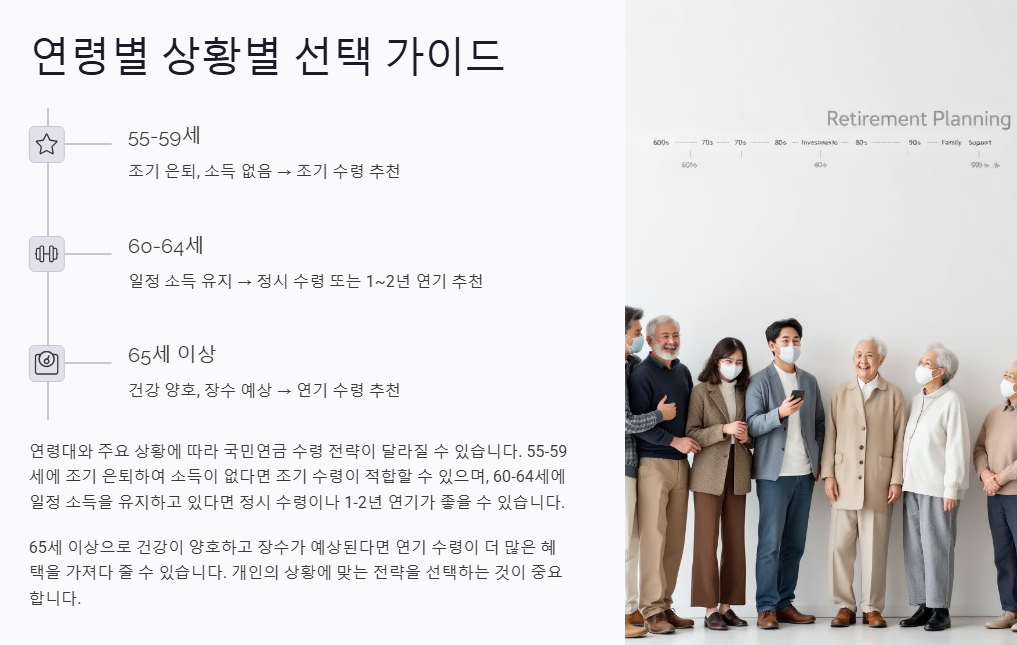 다음은 연령대와 주요 상황에 따른 국민연금 수령 전략 가이드입니다.