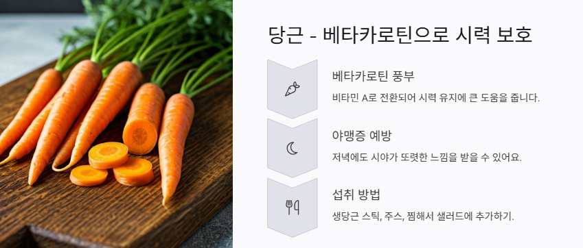 어릴 때부터 "당근 먹으면 눈 좋아진다"는 말, 다들 들어보셨죠? 과학적으로도 맞는 이야기예요. 당근에 풍부한 베타카로틴이 비타민 A로 전환되어 시력 유지에 큰 도움을 준답니다. 특히 야맹증 예방에 탁월해서, 저녁에도 시야가 또렷한 느낌을 받고 싶다면 꼭 챙겨야 해요.