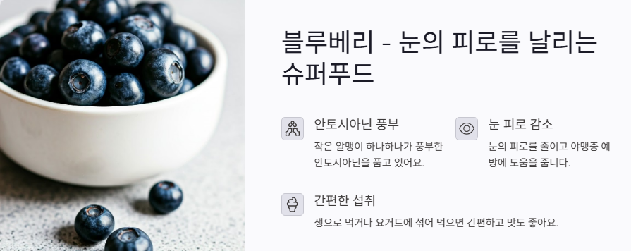블루베리는 진짜 눈 건강의 친구예요. 작은 알맹이 하나하나가 풍부한 안토시아닌을 품고 있는데, 이게 바로 눈의 피로를 줄이고 야맹증 예방에 도움을 준다고 해요. 제가 직접 경험해 본 바로는, 블루베리를 꾸준히 먹었을 때 눈이 훨씬 덜 뻑뻑하고, 야근 후에도 덜 흐릿해지는 느낌이었어요. 특히 생으로 먹거나 요거트에 섞어 먹으면 간편하고 맛도 좋아서 매일 챙기기 정말 좋아요.
