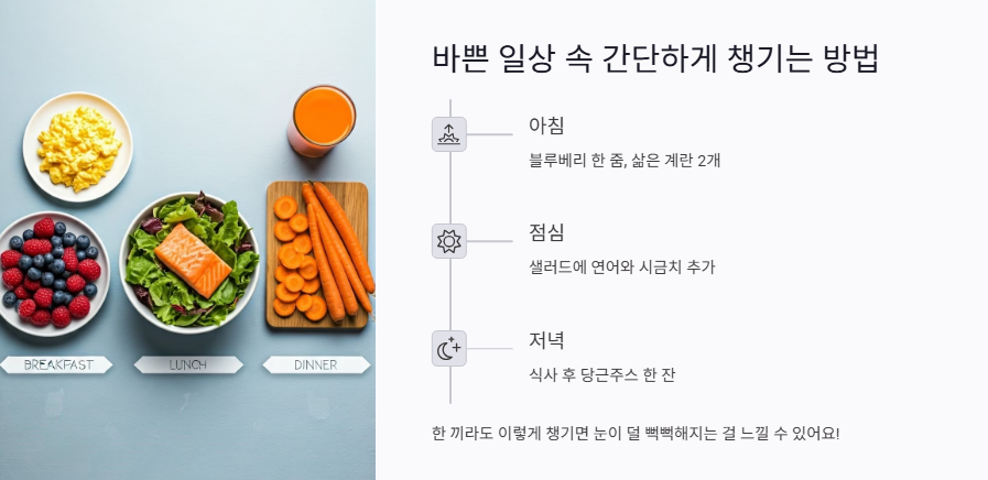 사실 알고 있어도 매일 챙기기 쉽지 않잖아요? 그래서 저는 이렇게 간단하게 실천하고 있어요. 정말 한 끼라도 이렇게 챙기면, 확실히 눈이 덜 뻑뻑해지는 걸 느낄 수 있어요!