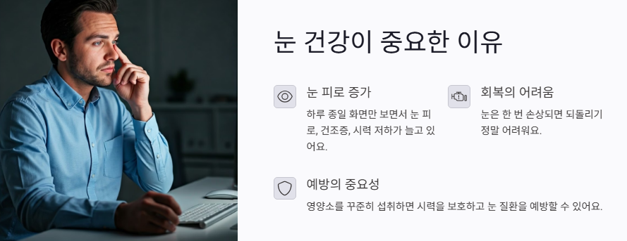 여러분, 진짜 요즘은 하루 종일 화면만 보고 있잖아요. 그래서 그런지 눈 피로, 건조증, 심하면 시력 저하까지 겪는 사람들이 늘어나고 있어요. 눈은 한 번 손상되면 되돌리기 정말 어렵다는 거 알고 계셨나요? 그래서 평소에 신경 쓰는 게 중요해요. 특히 눈 건강을 지켜주는 영양소를 꾸준히 섭취하면, 장기적으로 시력을 보호하고 눈 질환을 예방할 수 있답니다.