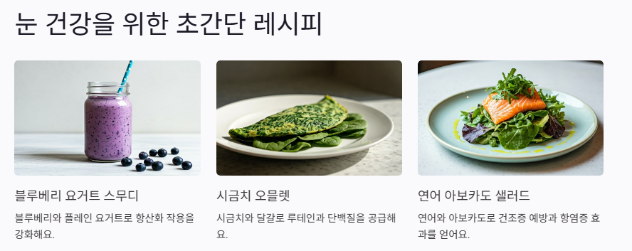| 시금치 오믈렛 | 시금치, 달걀 | 루테인, 단백질 공급 |